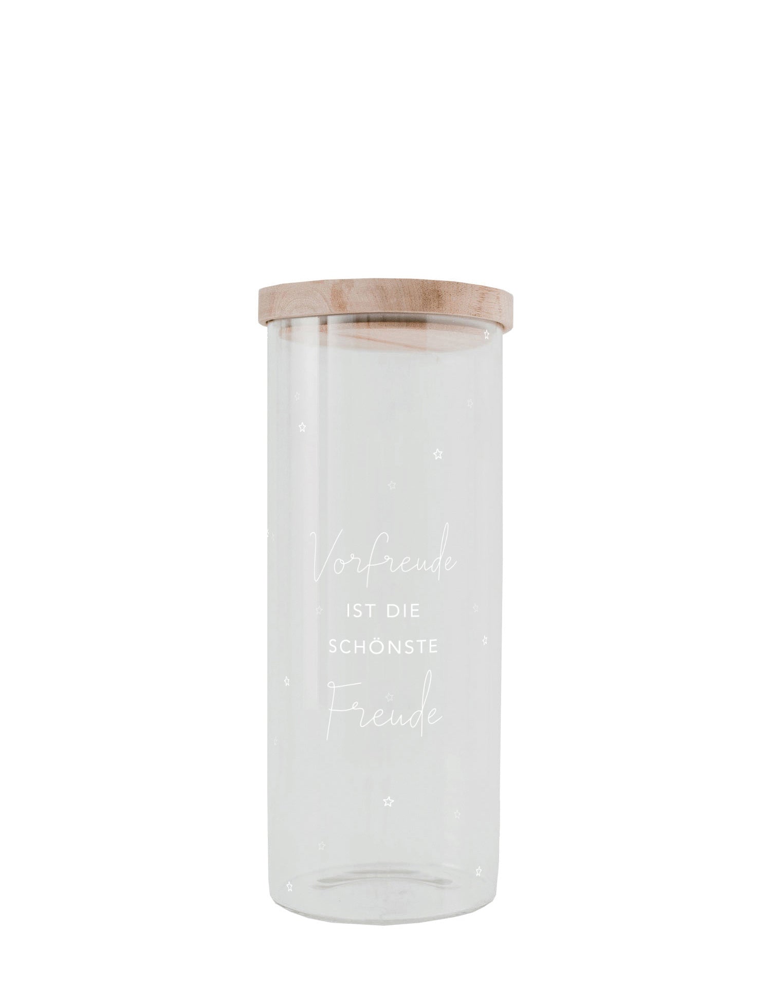 Entdecke unser festliches und praktisches Vorratsglas Vorfreude 25 cm aus Borosilikatglas mit Akazienholz Deckel.